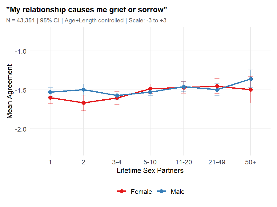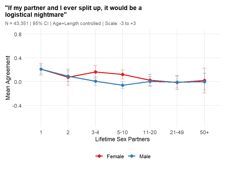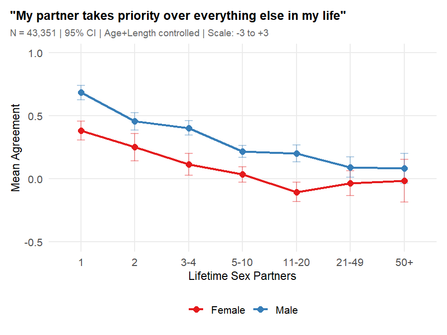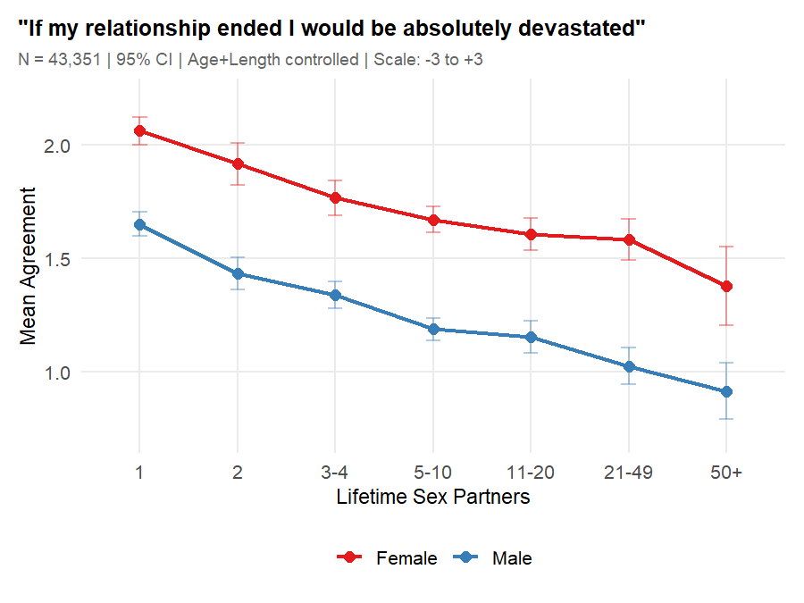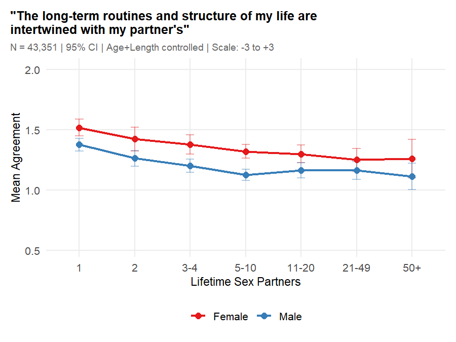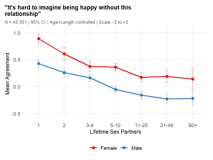 In general, the higher someone’s bodycount, the less likely they were to agree with questions related to codependency/intertwinedness: