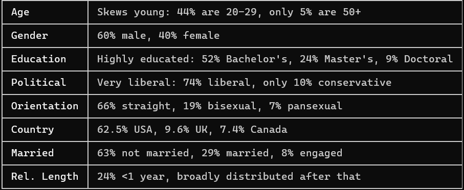 Lately we’ve been looking at my relationships survey, which went semi-viral (only like, ~60k for most questions, this particular one has ~40k due to me adding the question late). Demographics:
