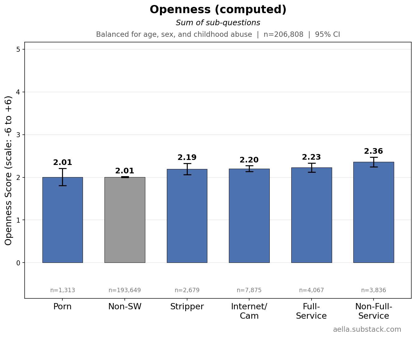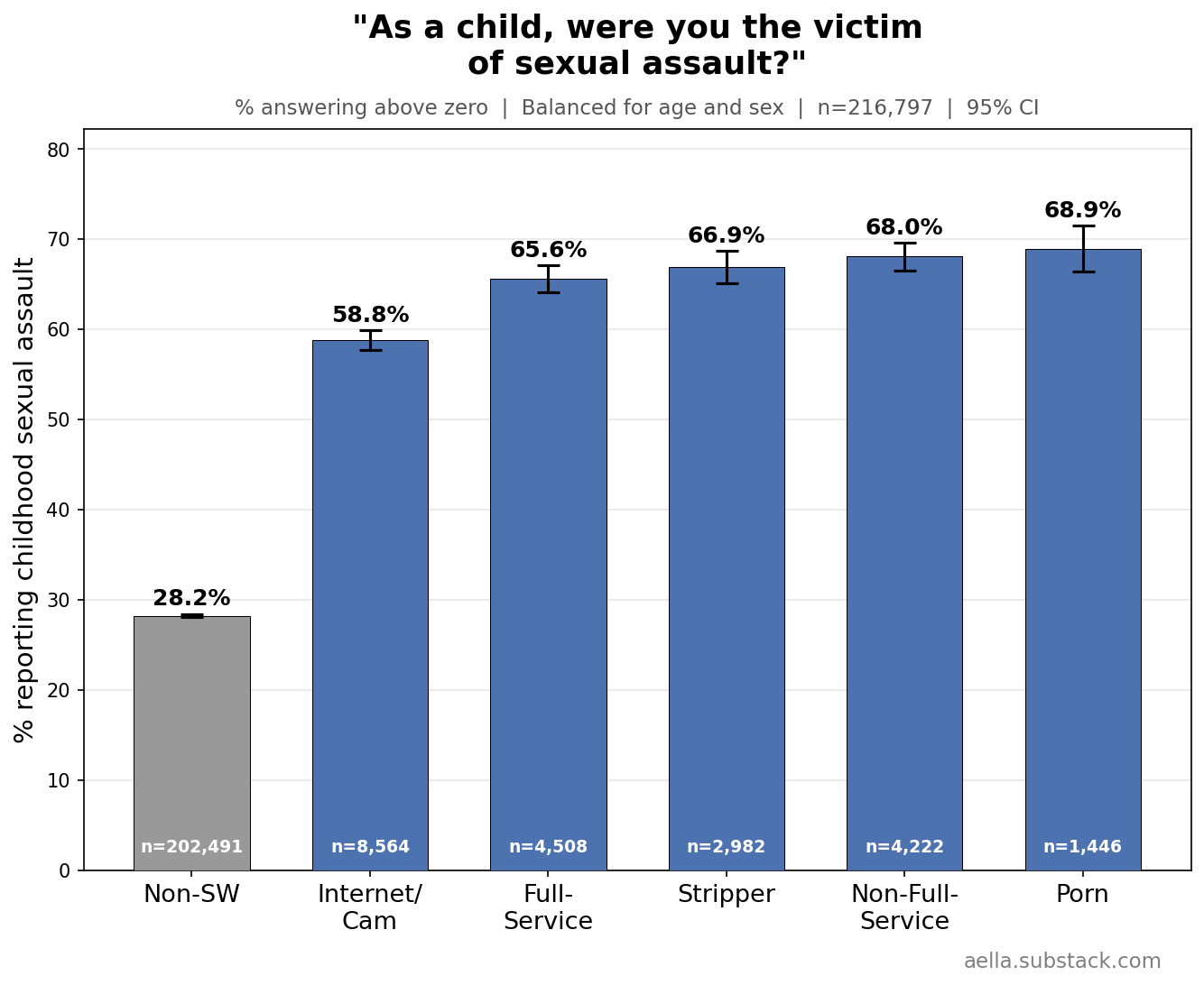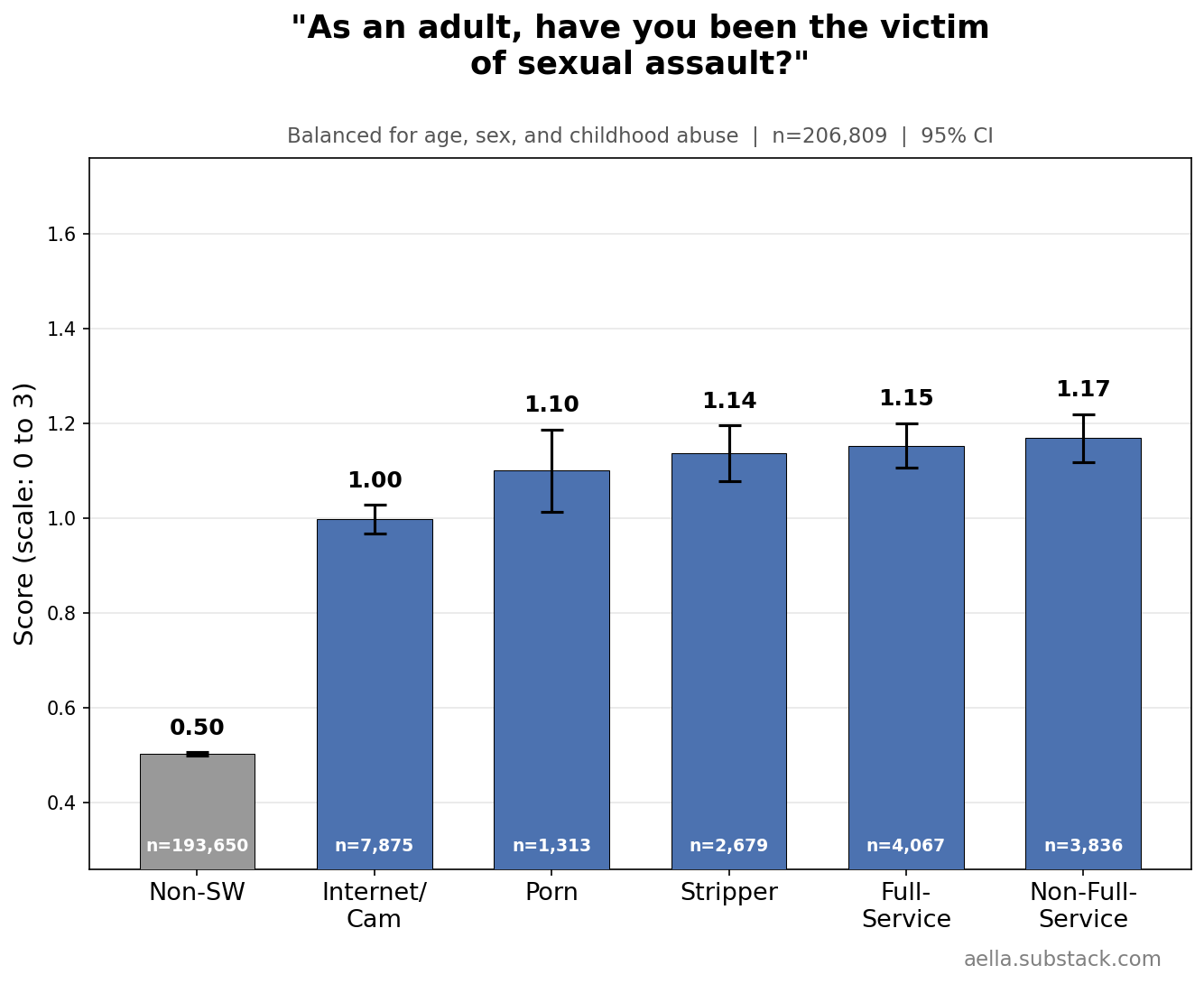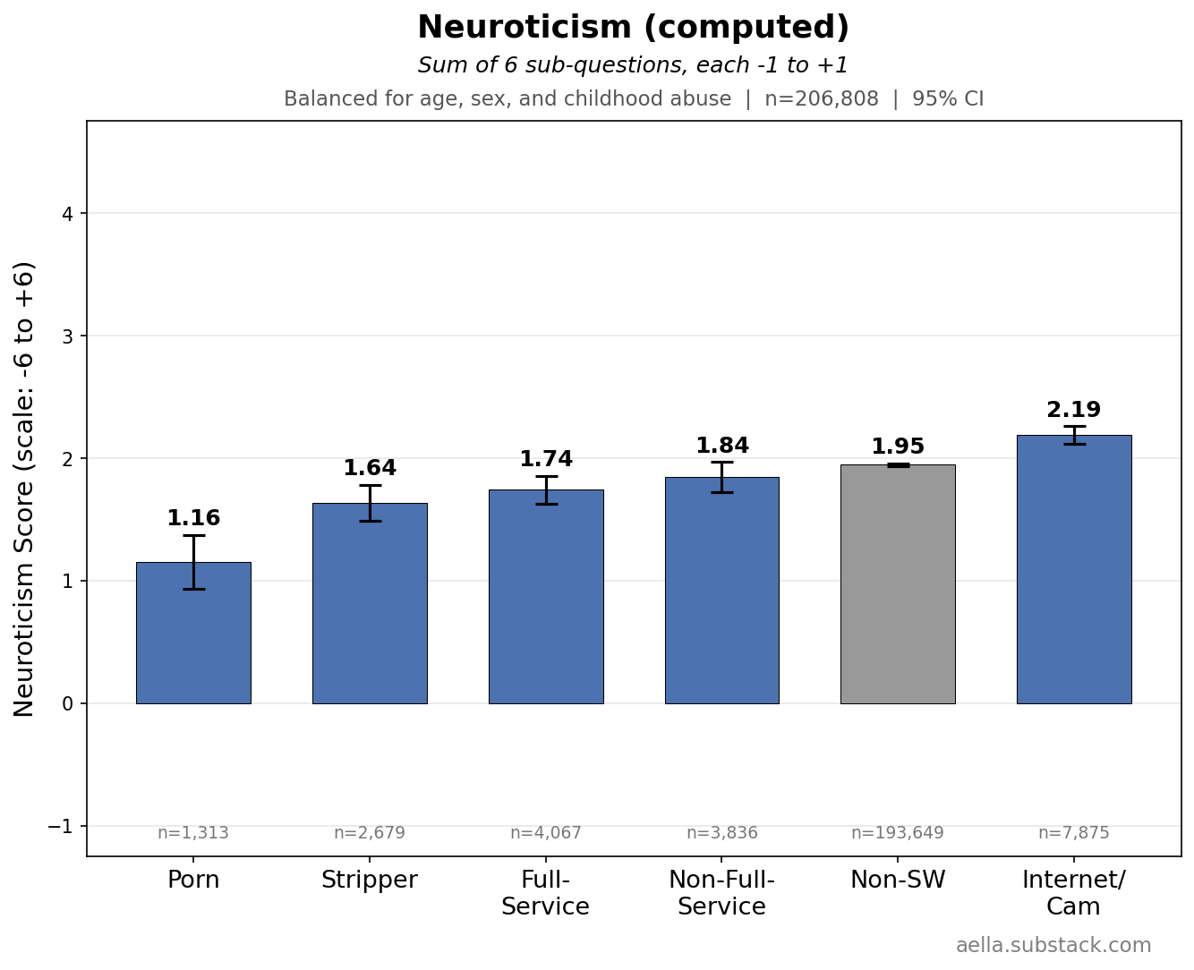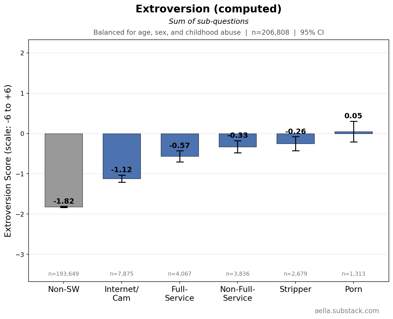 These above are things I’m gonna control for in the following graphs, since age, childhood abuse, and biological sex seem to be pretty related to stuff we’re trying to disentangle from sex work. You might argue ‘wait, childhood abuse seems weird to control for, what if we wanna know what abused sex workers get up to’ and… maybe, but I find it more interesting to know how sex workers differ from the average population independently of childhood abuse. So I’m making sure ‘any childhood abuse’ and ‘no childhood abuse’ have the same ratio across categories. Keep in mind we’ll likely still see ‘severity’ of childhood