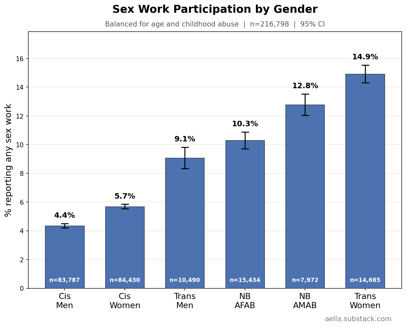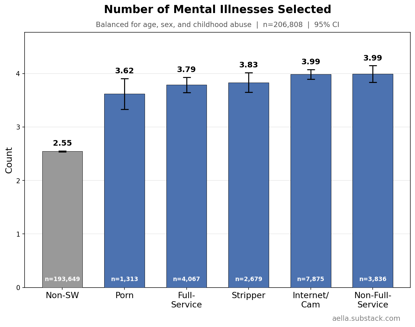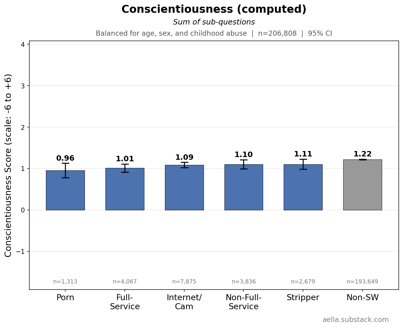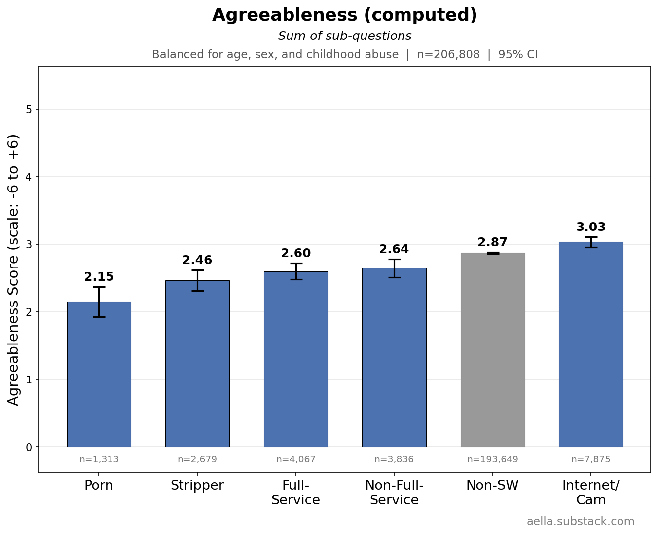 These above are things I’m gonna control for in the following graphs, since age, childhood abuse, and biological sex seem to be pretty related to stuff we’re trying to disentangle from sex work. You might argue ‘wait, childhood abuse seems weird to control for, what if we wanna know what abused sex workers get up to’ and… maybe, but I find it more interesting to know how sex workers differ from the average population independently of childhood abuse. So I’m making sure ‘any childhood abuse’ and ‘no childhood abuse’ have the same ratio across categories. Keep in mind we’ll likely still see ‘severity’ of childhood