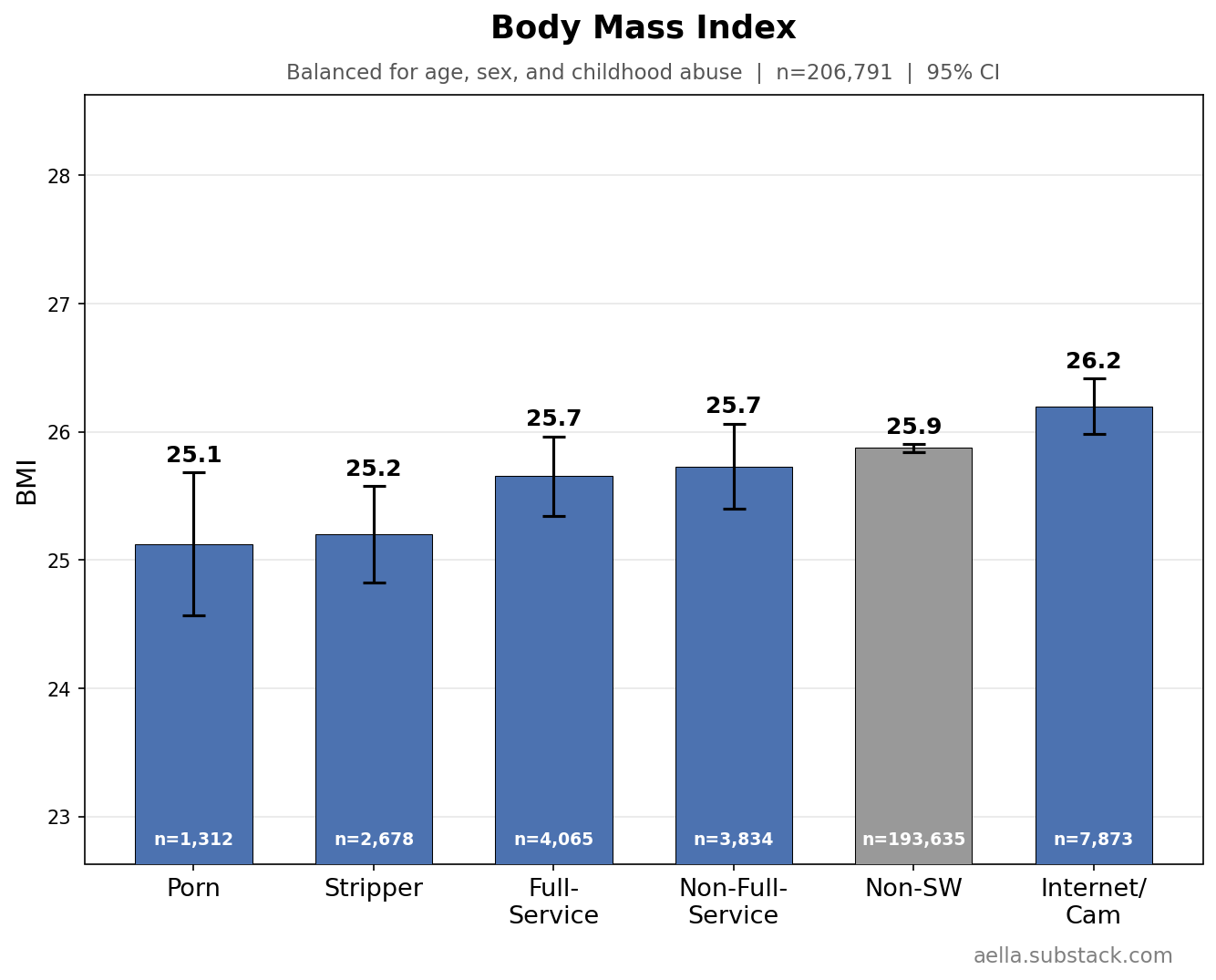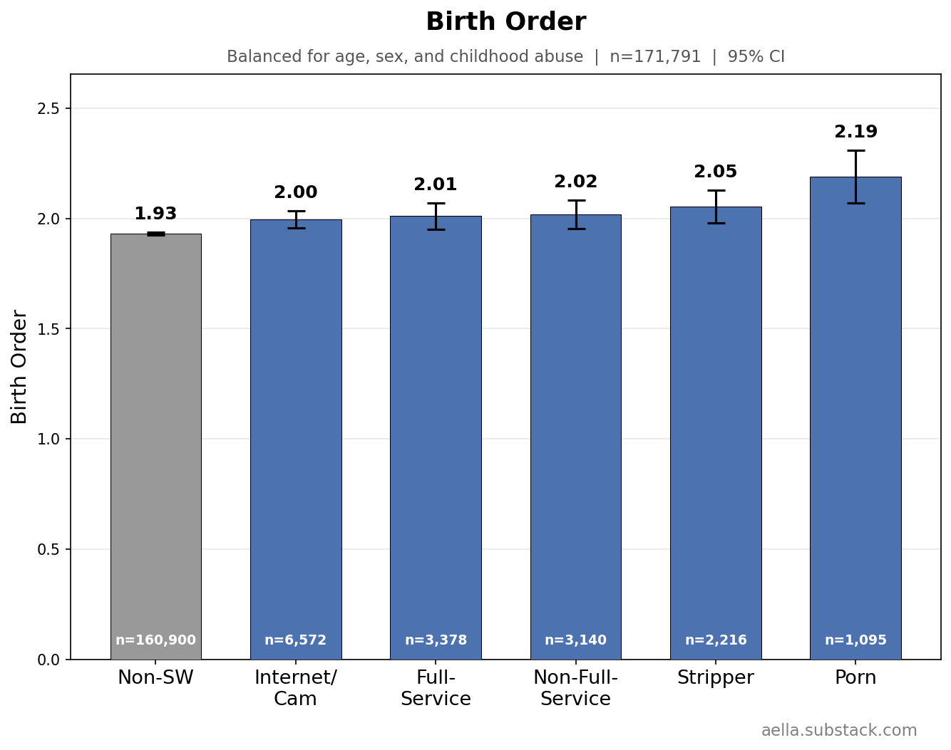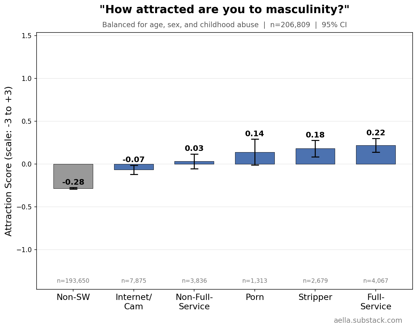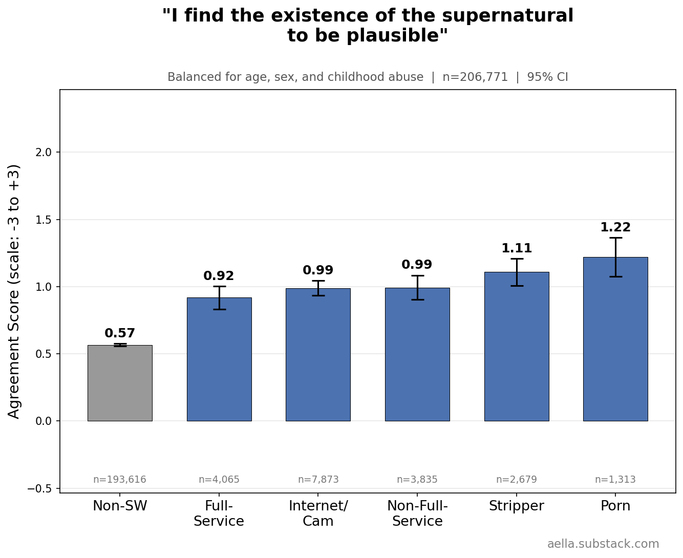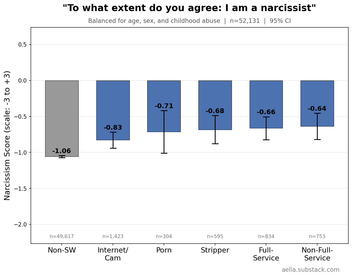 These above are things I’m gonna control for in the following graphs, since age, childhood abuse, and biological sex seem to be pretty related to stuff we’re trying to disentangle from sex work. You might argue ‘wait, childhood abuse seems weird to control for, what if we wanna know what abused sex workers get up to’ and… maybe, but I find it more interesting to know how sex workers differ from the average population independently of childhood abuse. So I’m making sure ‘any childhood abuse’ and ‘no childhood abuse’ have the same ratio across categories. Keep in mind we’ll likely still see ‘severity’ of childhood