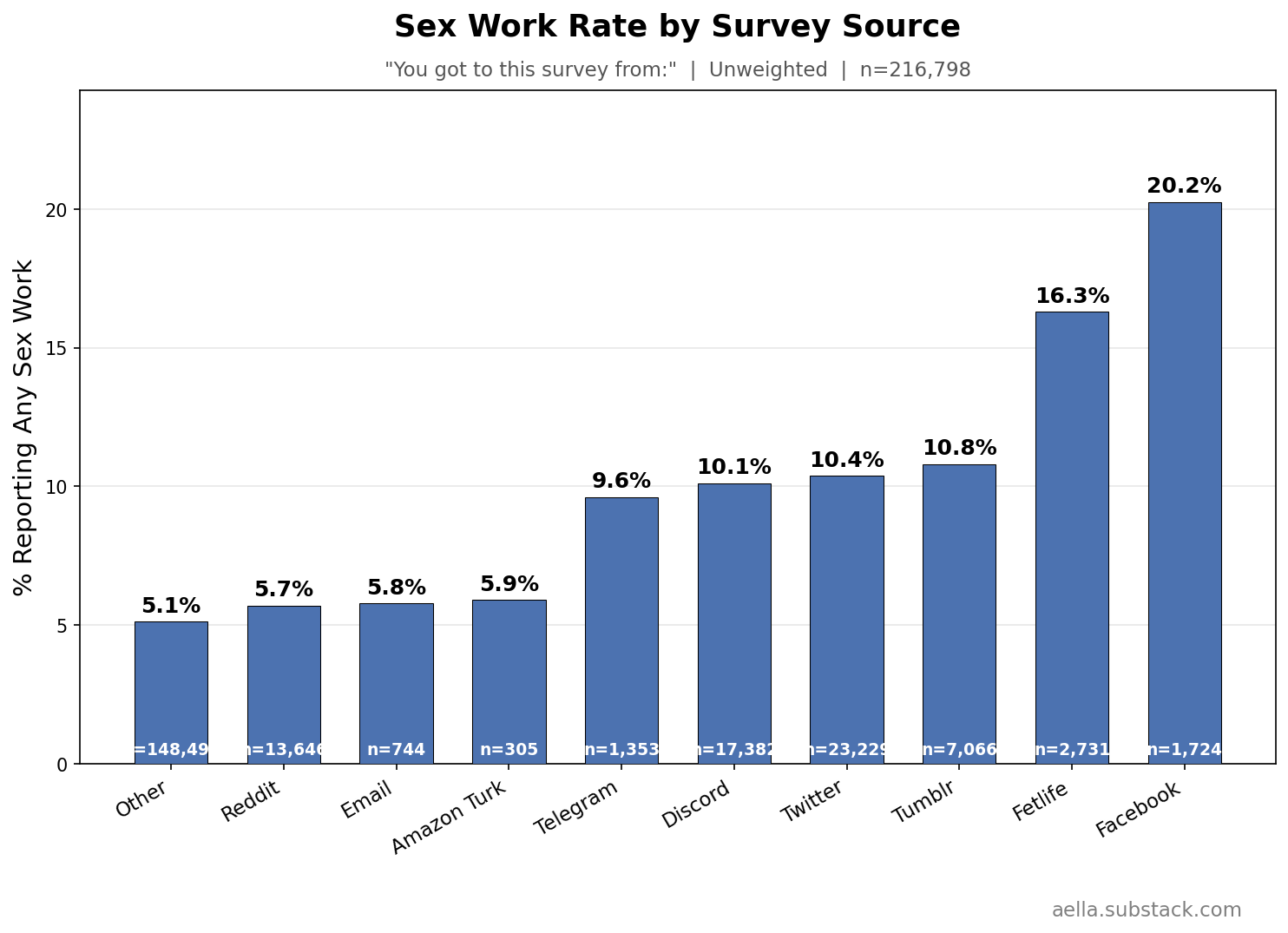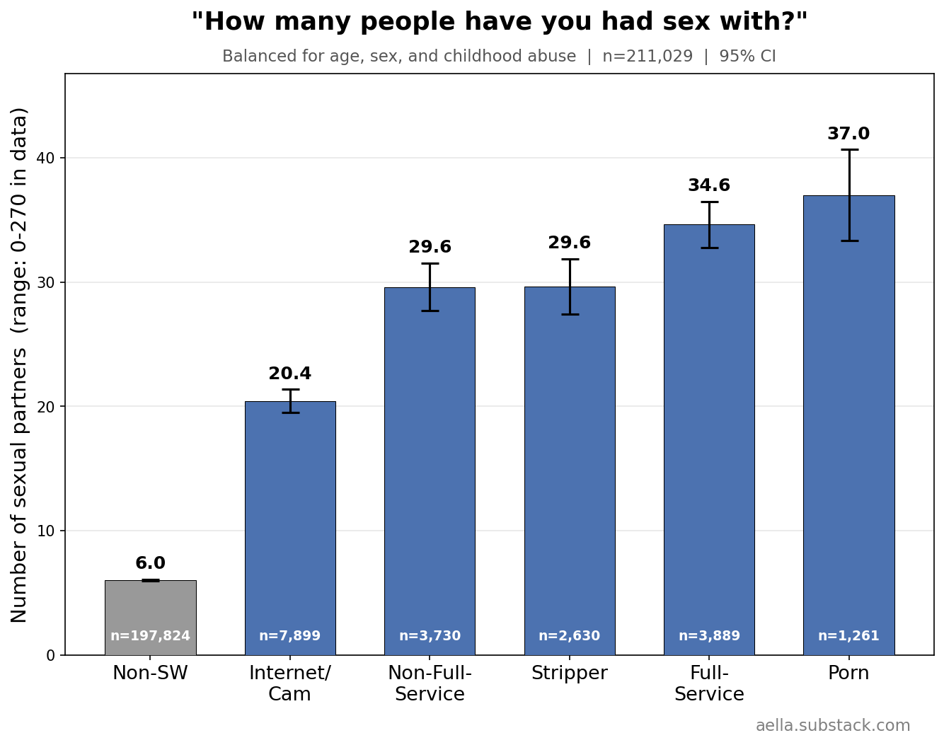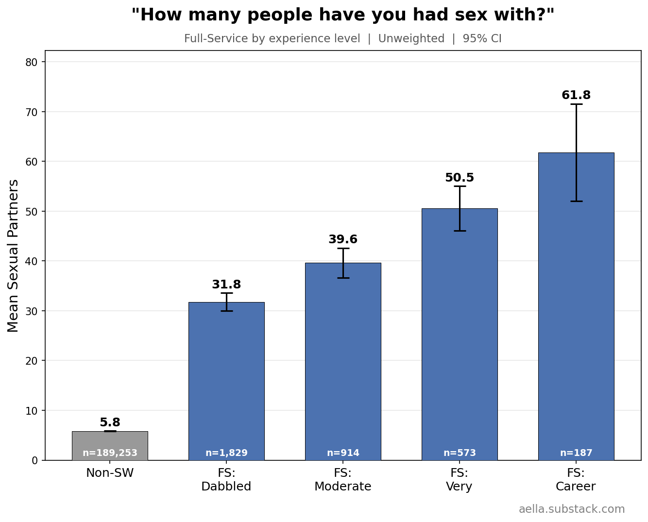 I added sex work questions late, so we have a lower sample - in the low 200ks, of which ~15k reported having any sex work experience. I asked if you’d ever done sex work. If yes, I give a series of questions about subtypes of sex work. If you answer yes to those, I ask how experienced you were, and how good your experience in that sex work was.