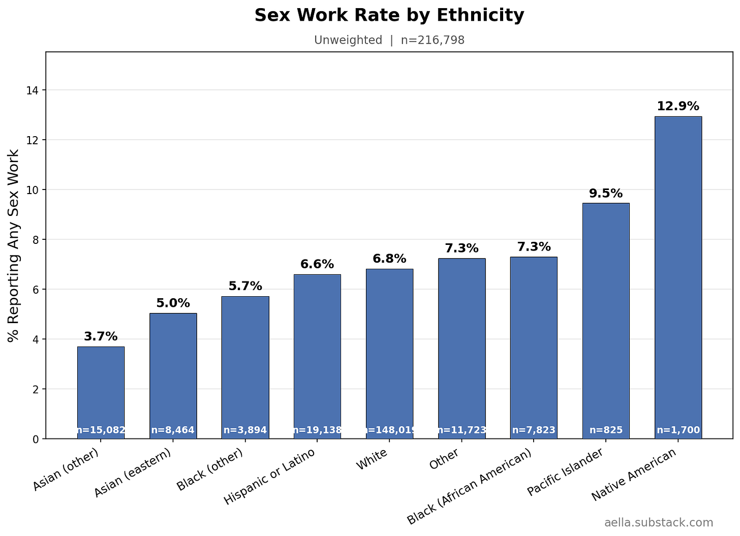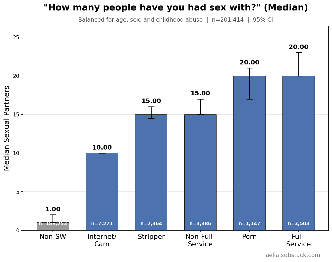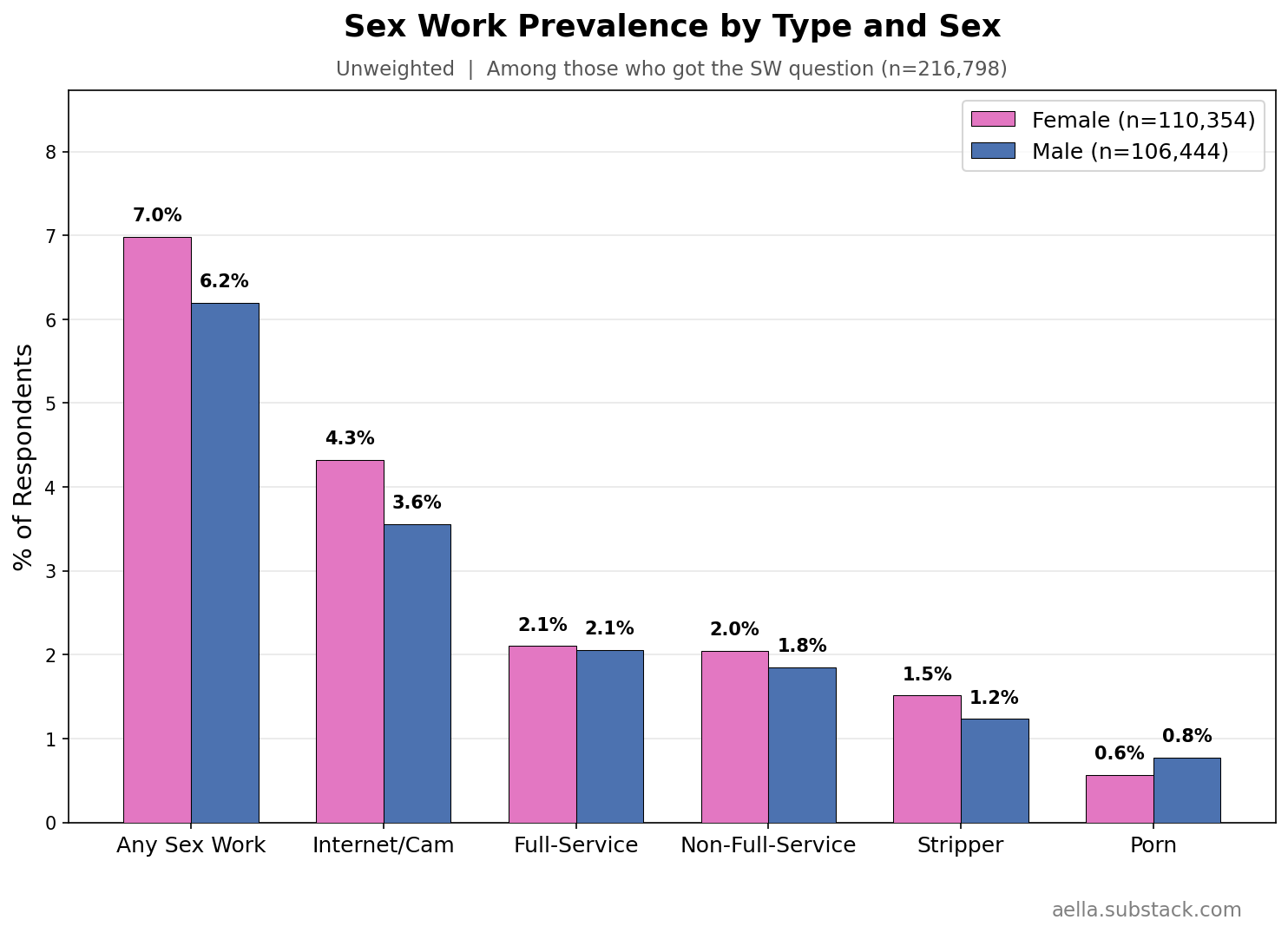 I added sex work questions late, so we have a lower sample - in the low 200ks, of which ~15k reported having any sex work experience. I asked if you’d ever done sex work. If yes, I give a series of questions about subtypes of sex work. If you answer yes to those, I ask how experienced you were, and how good your experience in that sex work was.