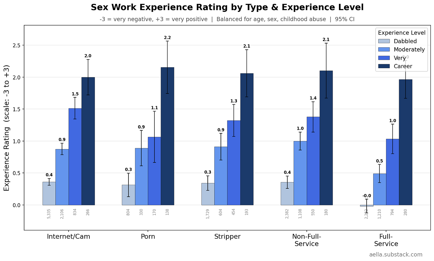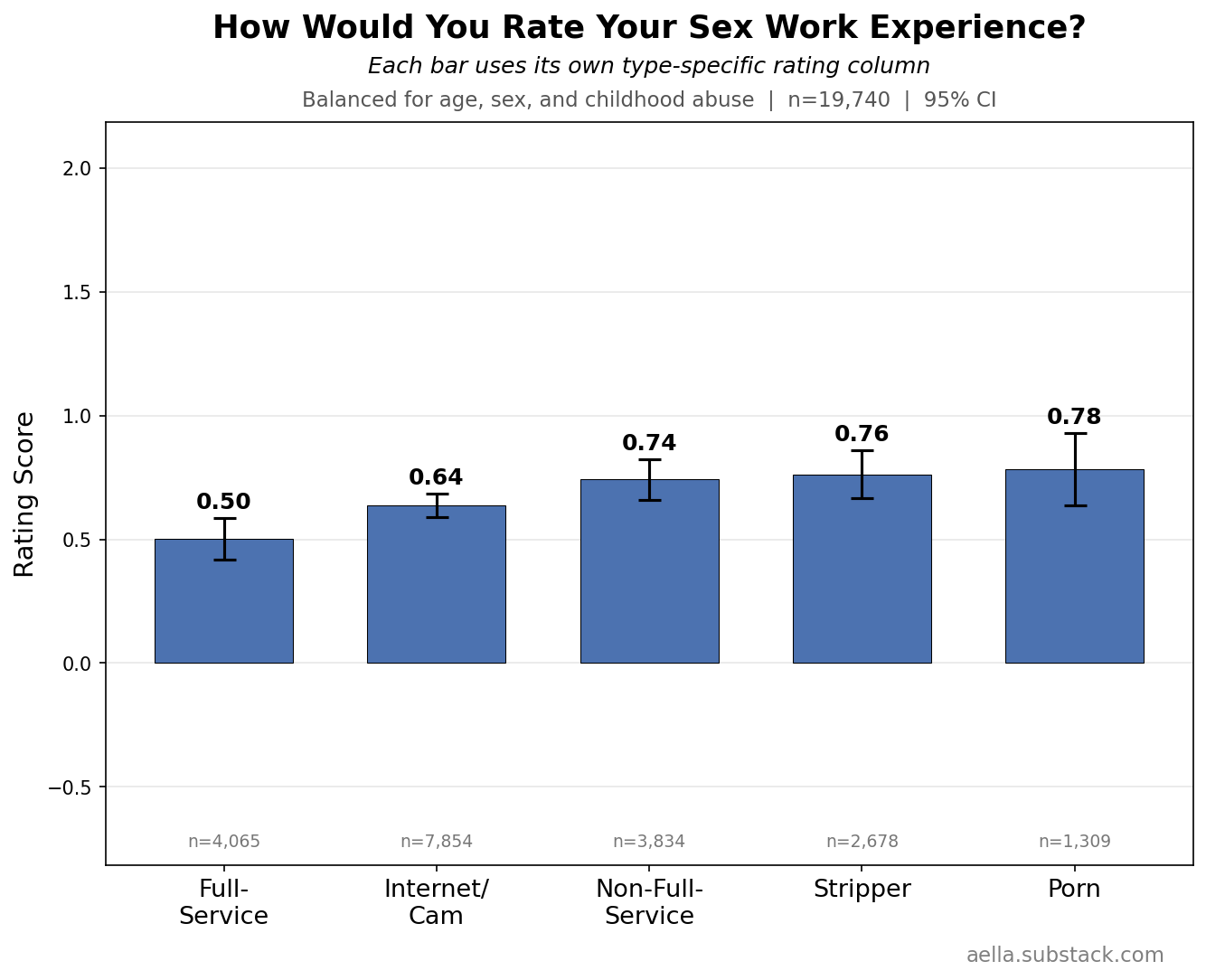 I asked people to rate their experience in their type of sex work from negative to positive. This was the averaged results: all were slightly more positive than neutral, with full-service being the lowest rated and porn being the highest - an extremely surprising reuslt for me!