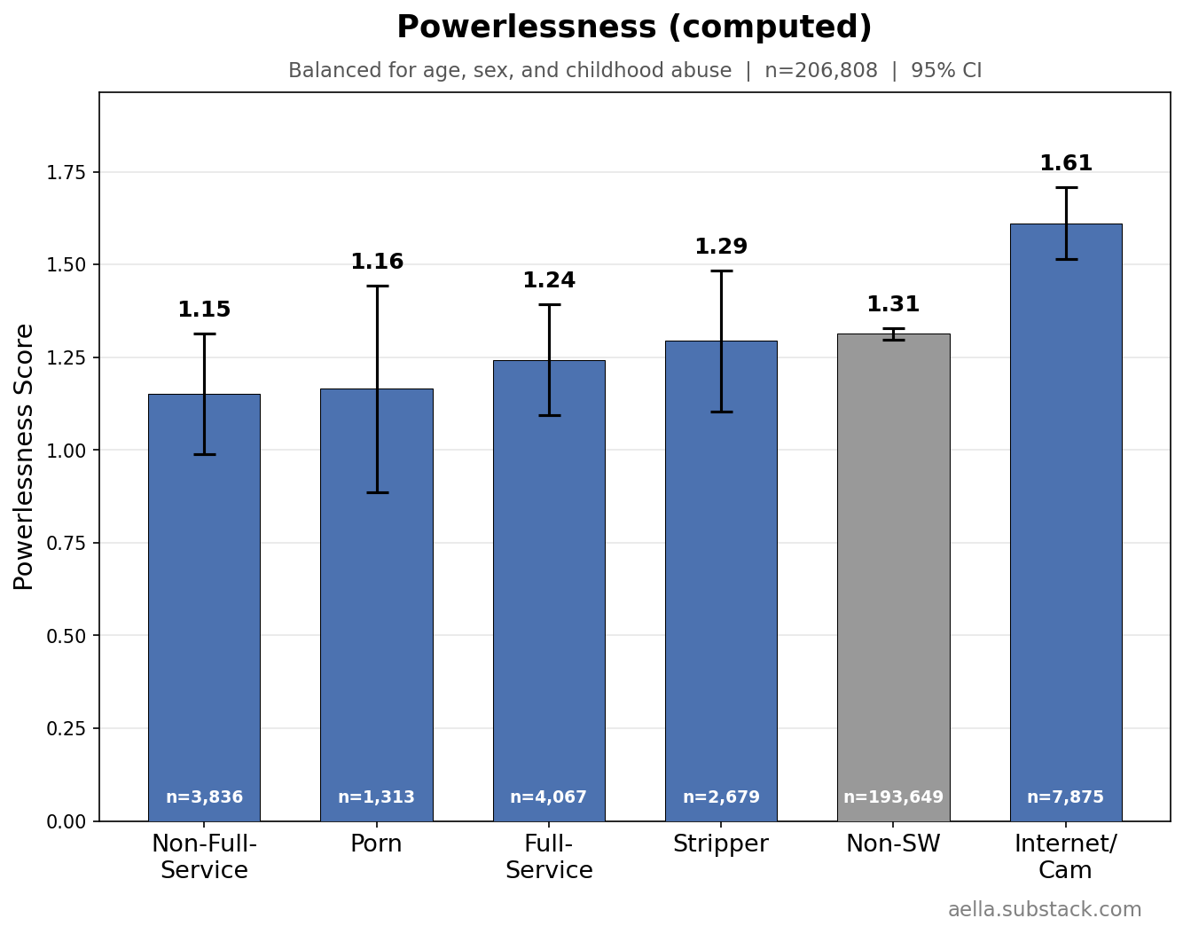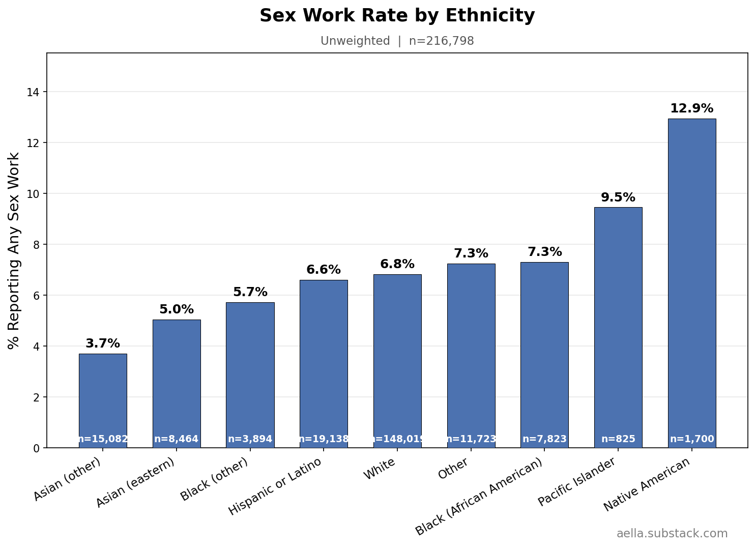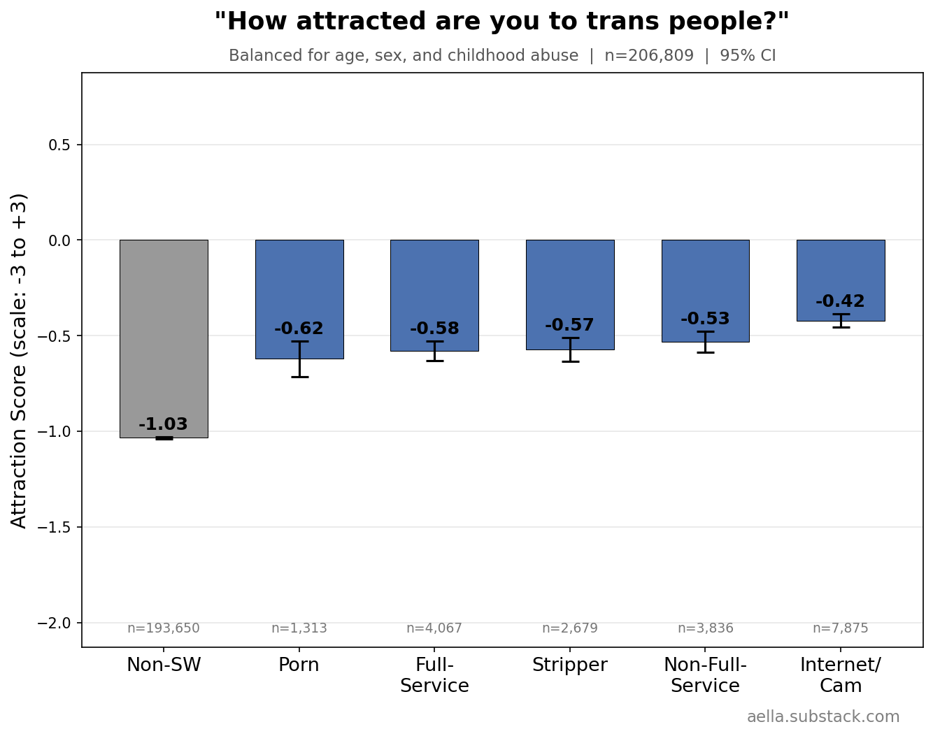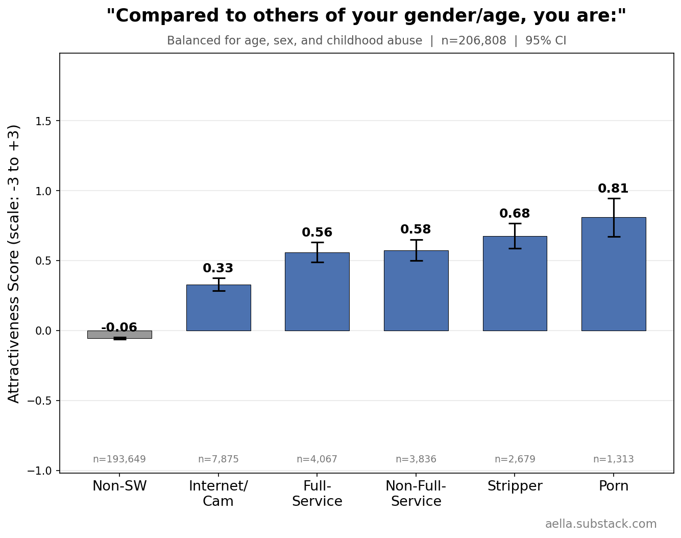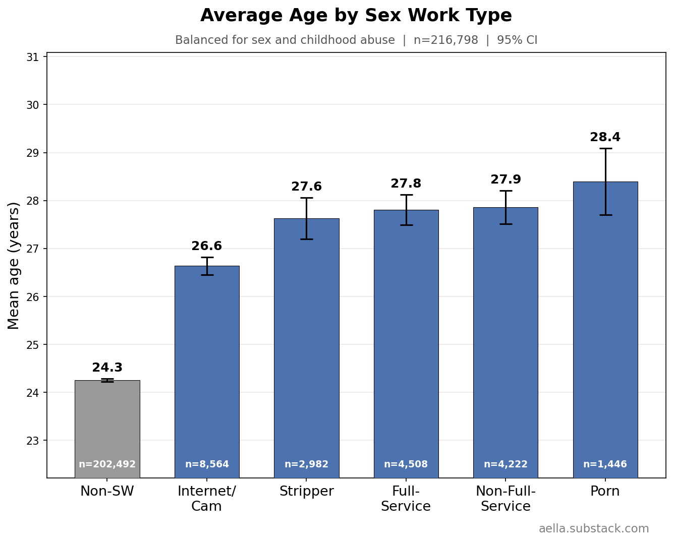 (I’m doing my age-controls crudely. Most of my respondents are in their 20’s; sex workers are 3-4 years older than sex workers, which is not enough to impact very much. So I’m just doing a basic 3-age-bin reweight. But still, there might be very slight age-related effects still poking through)